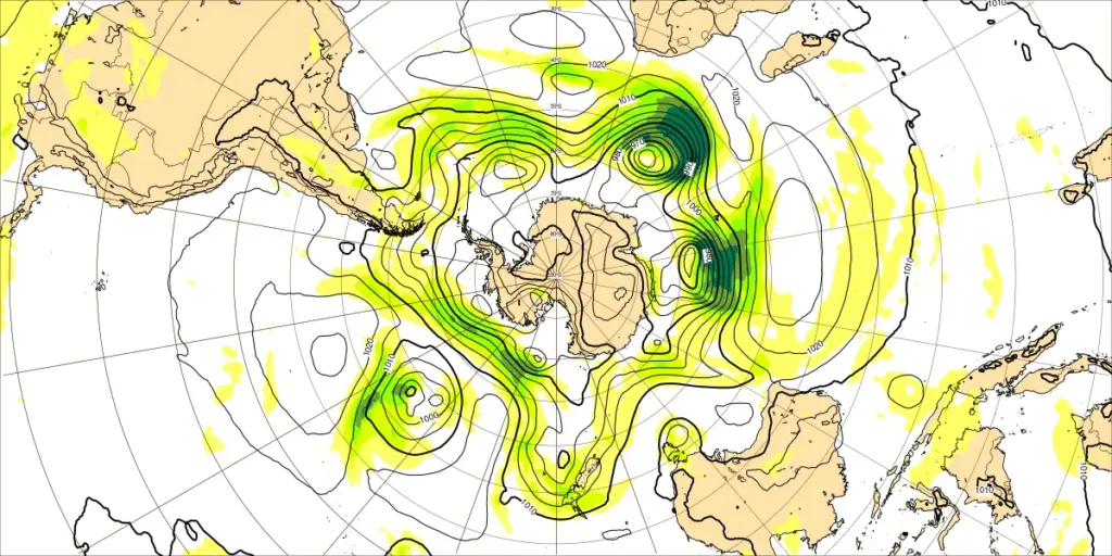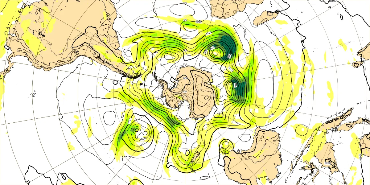 ・ニュージーランドの寒気トラフ:寒気北上、850hPa・0℃線が40S近くまで