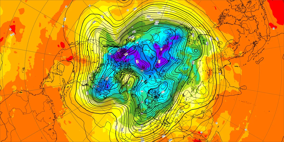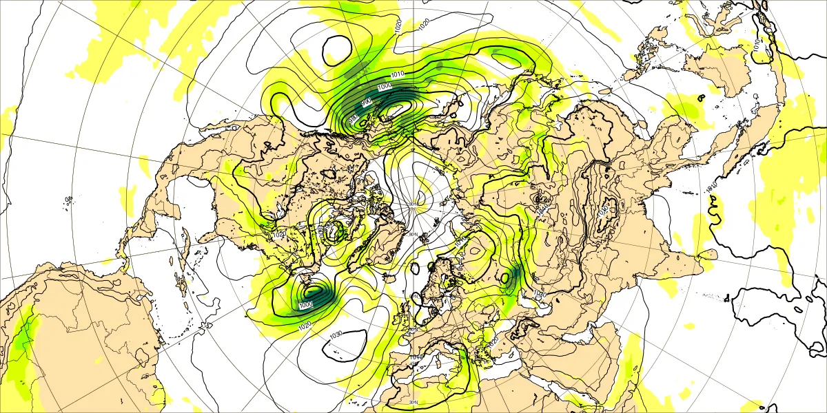 ・グリーンランドの高気圧:暖気北上、850hPa・0℃線が80N近くまで