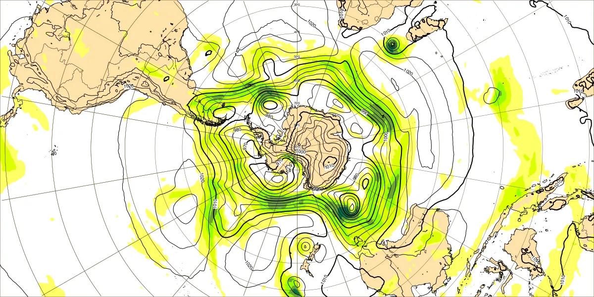・太平洋130Wの寒冷渦:寒気南下、850hPa・-4℃線が40Nまで
