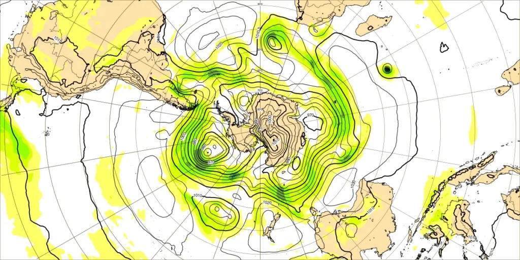 ・偏西風の蛇行は、小~大、特に南極大陸120Eのリッジの流れで蛇行大