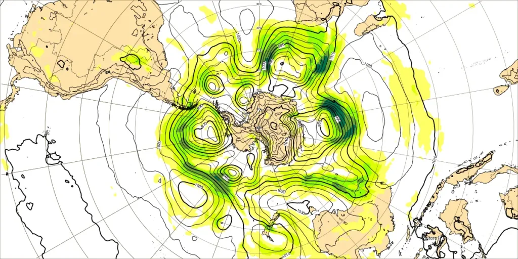 ・偏西風の蛇行は、やや大~大、特にニュージーランドの寒冷渦を周る流れで蛇行大
