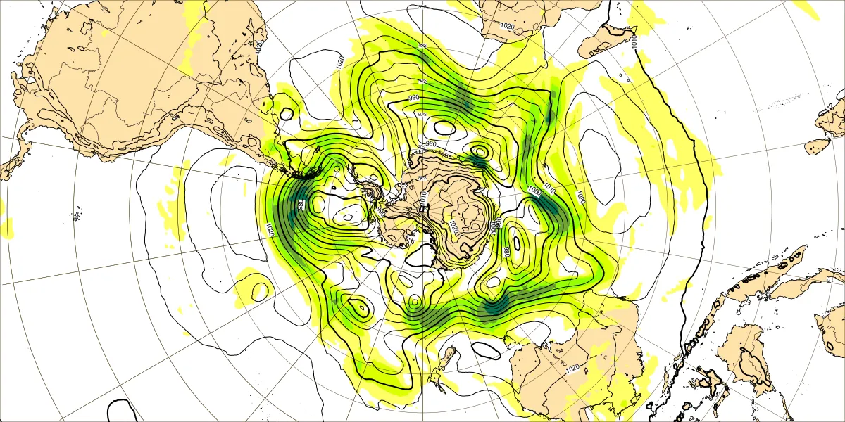 ・ニュージーランドの寒気トラフ:寒気北上、850hPa・0℃線が40Sまで