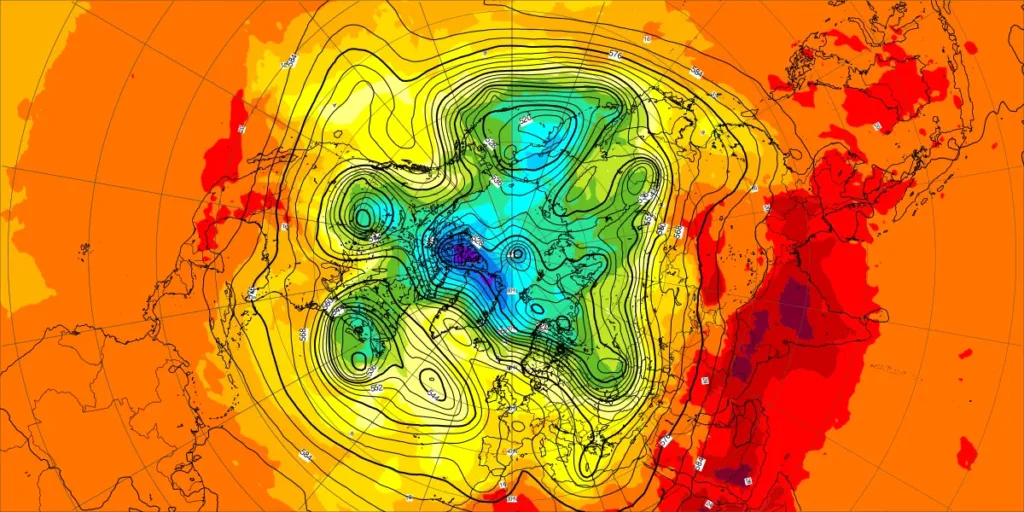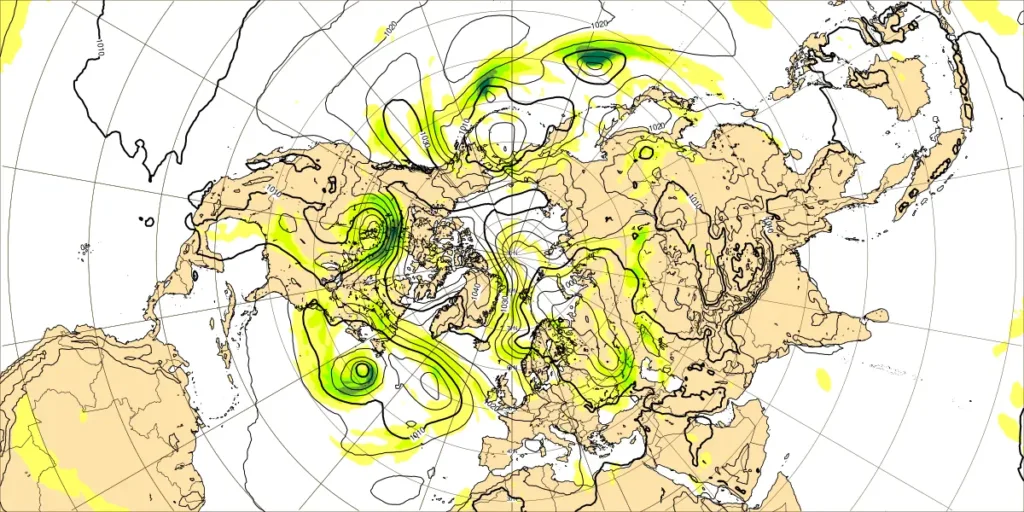 ・ロシア40Eの寒冷渦:寒気南下、850hPa・-4℃線が50N以南まで