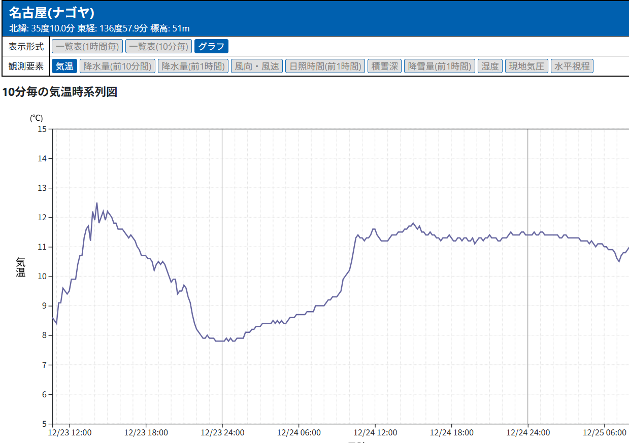 2025年12月25日 / 最終更新日 : 2025年12月25日 kionweb ブログ 気温日記 2025年12月24日 2025年12月24日:愛知県日進市 雨一時止み間。気温は昼前にかけて上昇後は11℃台でほぼ一定。最低気温は平年より大きく高い。 名古屋の気温 最高11.8℃ 15:10 平年差+1.1℃ 12月中旬並み 最低 7.8℃ 01:01 平年差+5.4℃ 11月中旬並み