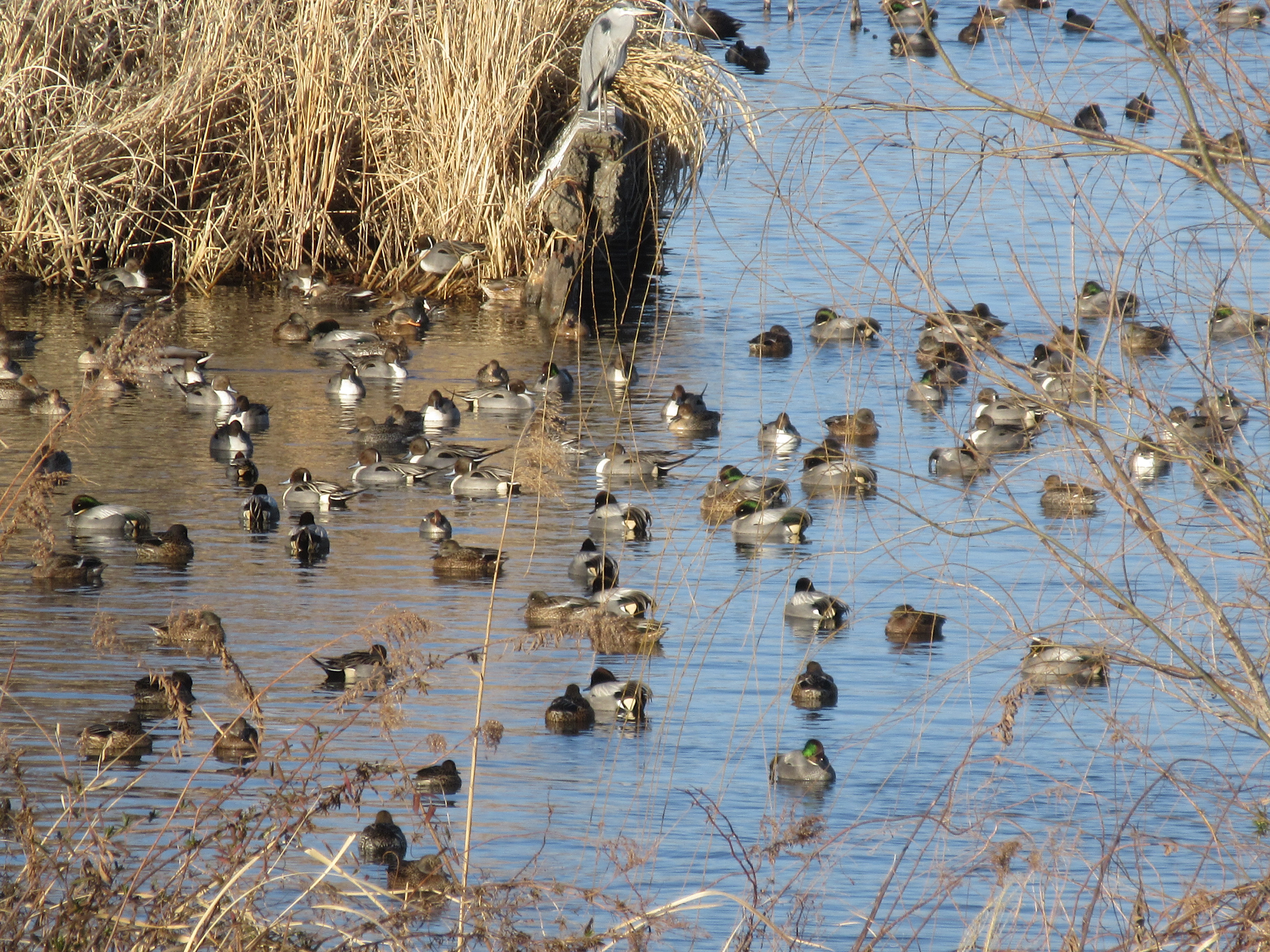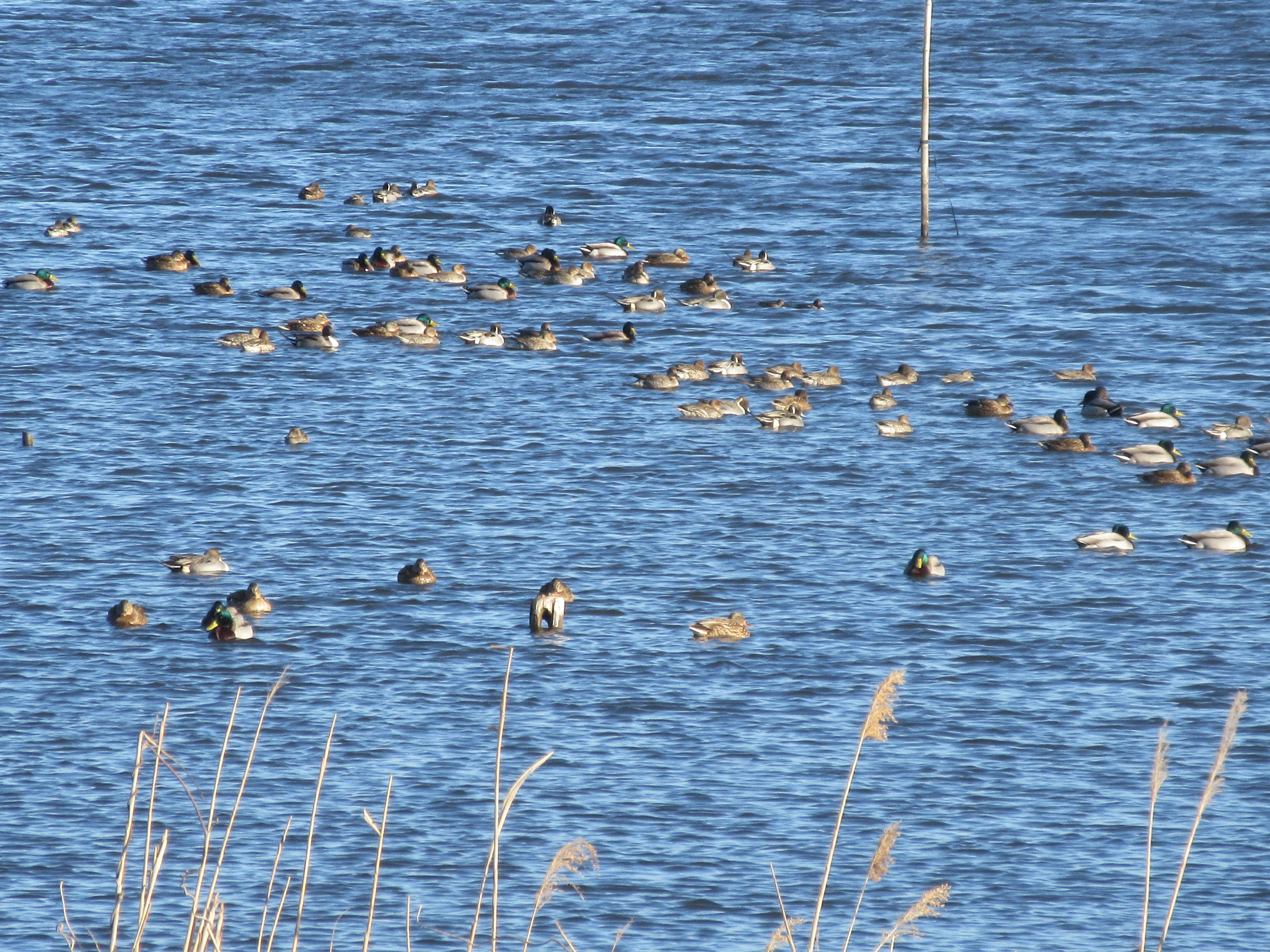 マガモ、オナガガモ。トモエガモは小群のみ