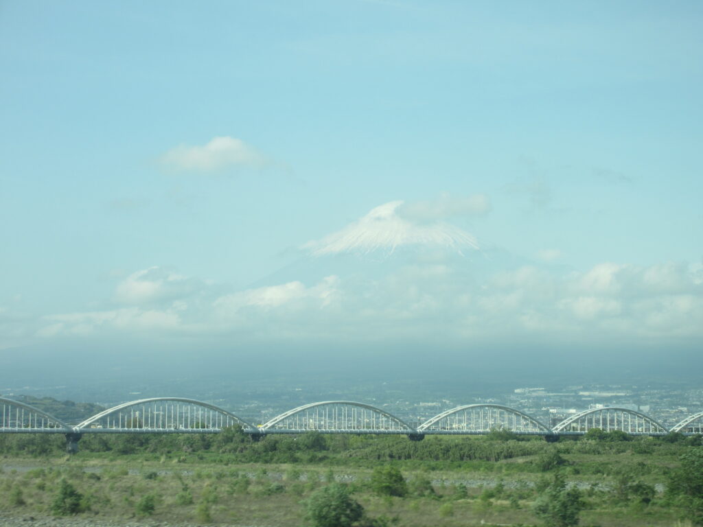 富士山:新幹線車窓、今日、富士山のほぼ全体が見えたのはこの場所(富士川橋梁)のみ