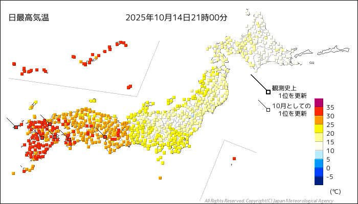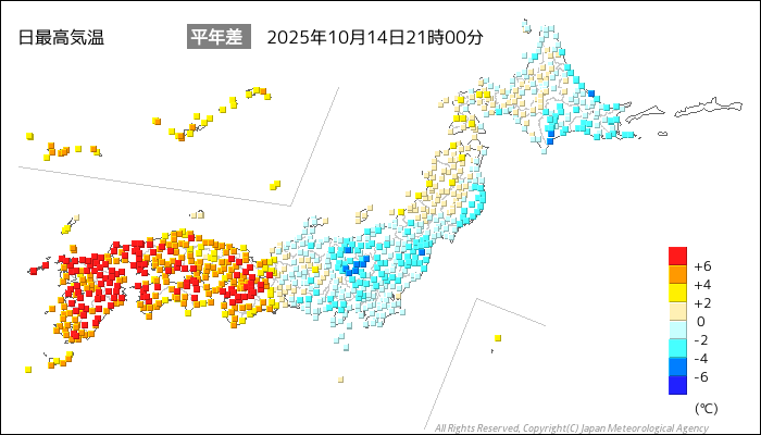 2025/10/14 | 21時までの最高気温平年差(小数点以下切り捨て) | |