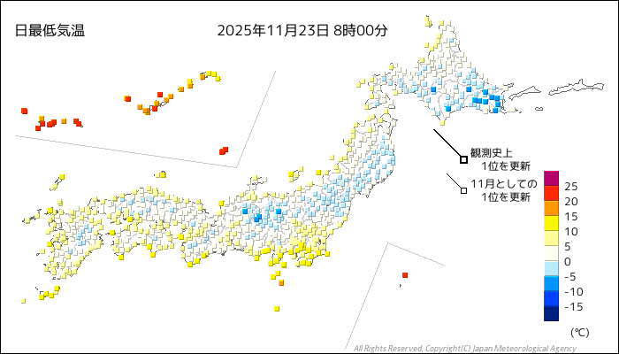 国内気温概況:2025年11月23日8時(日本時間)までの最低気温の平年差