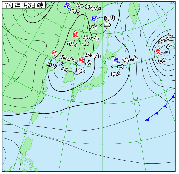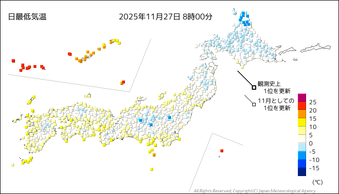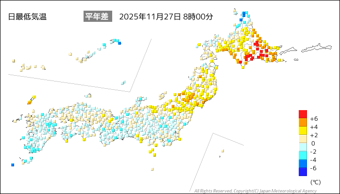 国内気温概況:2025年11月27日8時(日本時間)までの最低気温の平年差