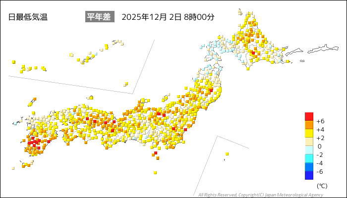 国内気温概況:2025年12月2日8時(日本時間)までの最低気温の平年差