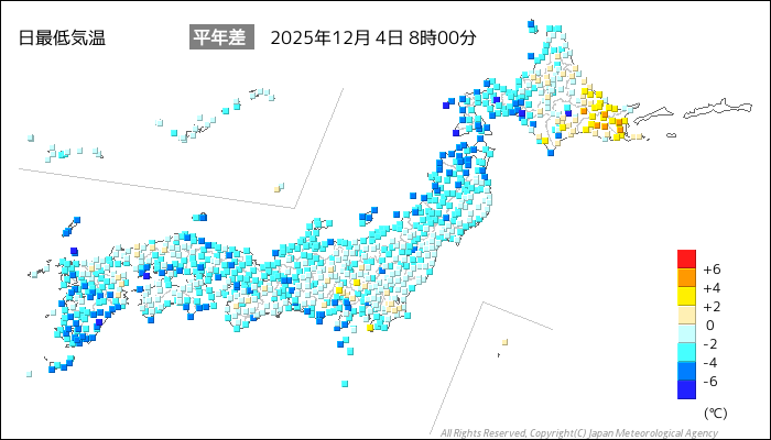 国内気温概況:2025年12月4日8時(日本時間)までの最低気温の平年差