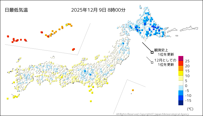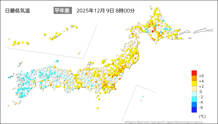 国内気温概況:2025年12月9日8時(日本時間)までの最低気温の平年差