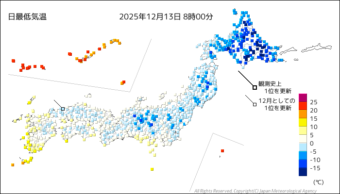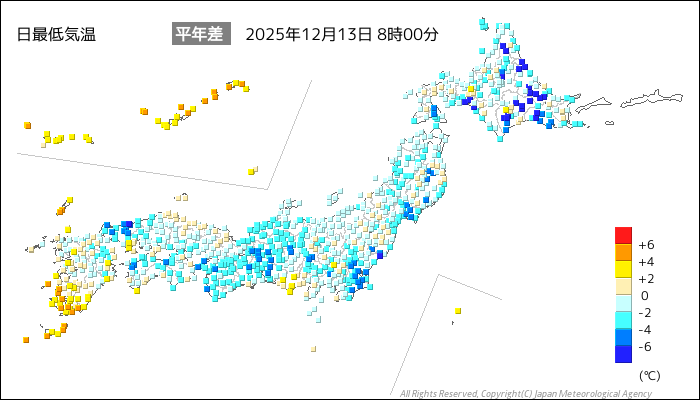 国内気温概況:2025年12月13日8時(日本時間)までの最低気温の平年差