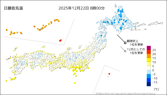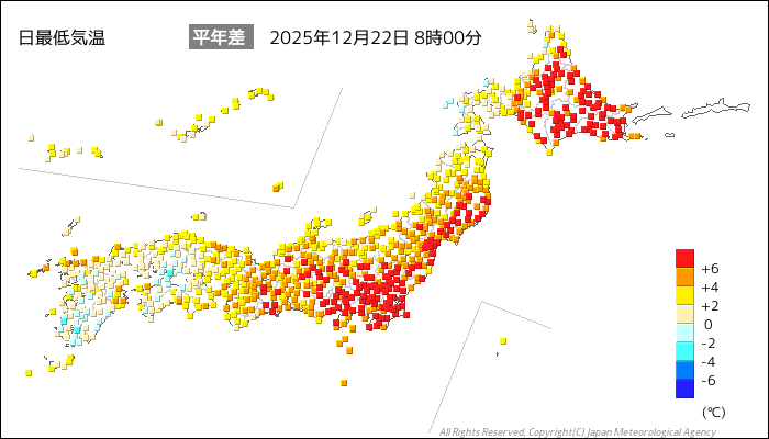 国内気温概況:2025年12月22日8時(日本時間)までの最低気温の平年差