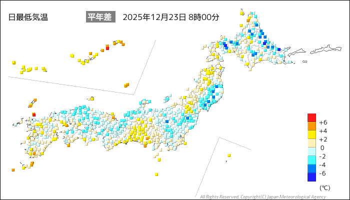 国内気温概況:2025年12月23日8時(日本時間)までの最低気温の平年差