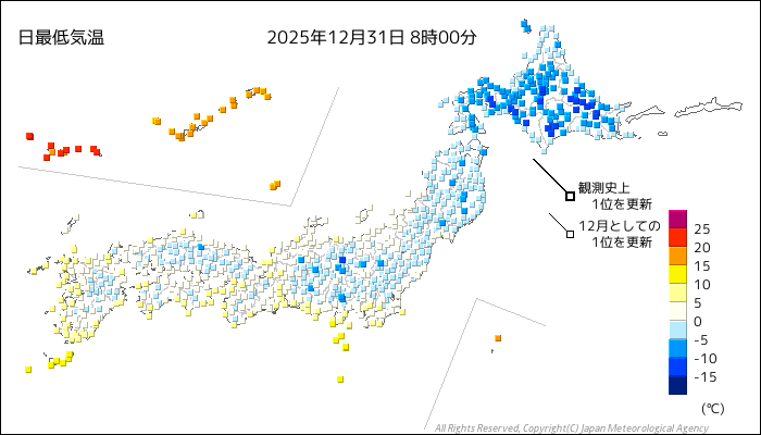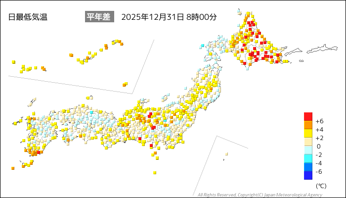 国内気温概況:2025年12月31日8時(日本時間)までの最低気温の平年差