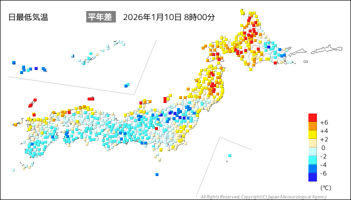 国内気温概況:2026年1月10日8時(日本時間)までの最低気温の平年差