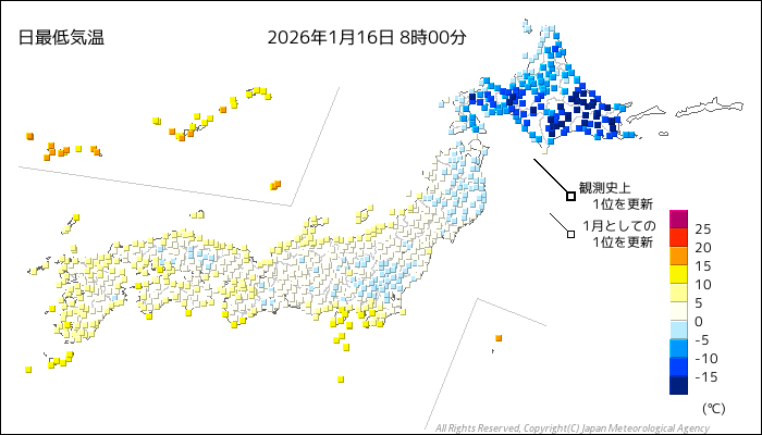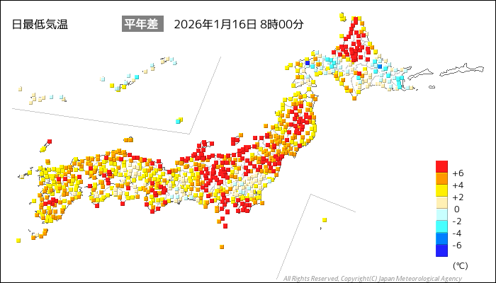 国内気温概況:2026年1月16日8時(日本時間)までの最低気温の平年差
