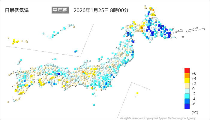 国内気温概況:2026年1月25日8時(日本時間)までの最低気温の平年差