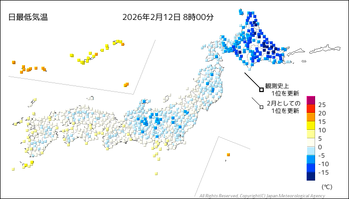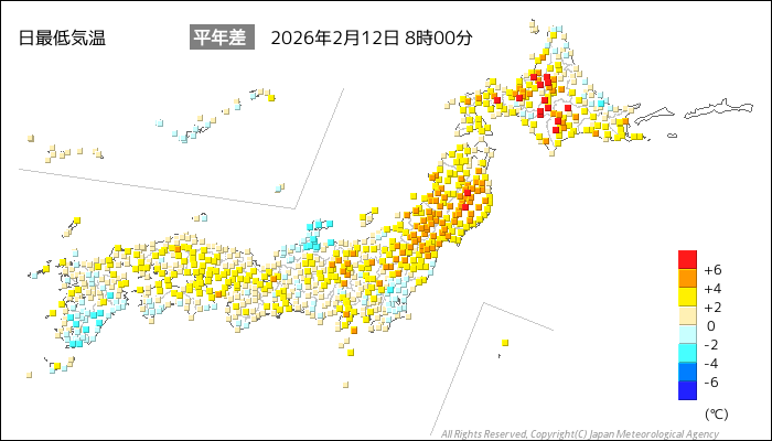 国内気温概況:2026年2月12日8時(日本時間)までの最低気温の平年差