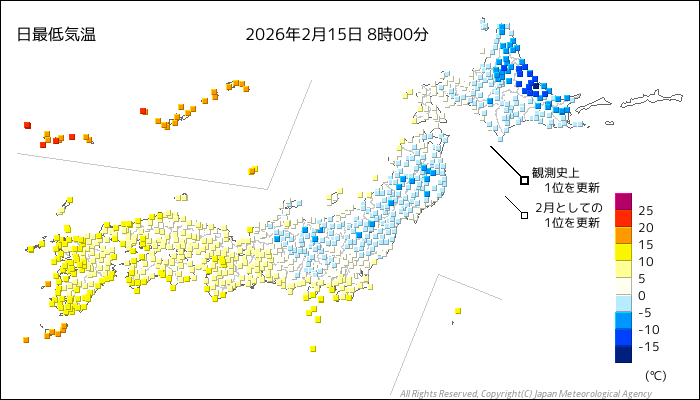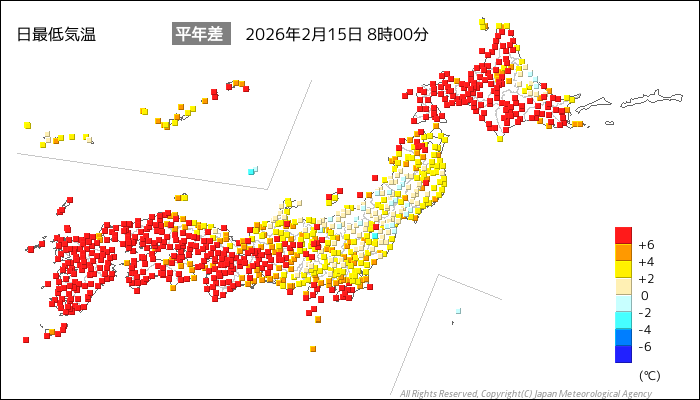 国内気温概況:2026年2月15日8時(日本時間)までの最低気温の平年差