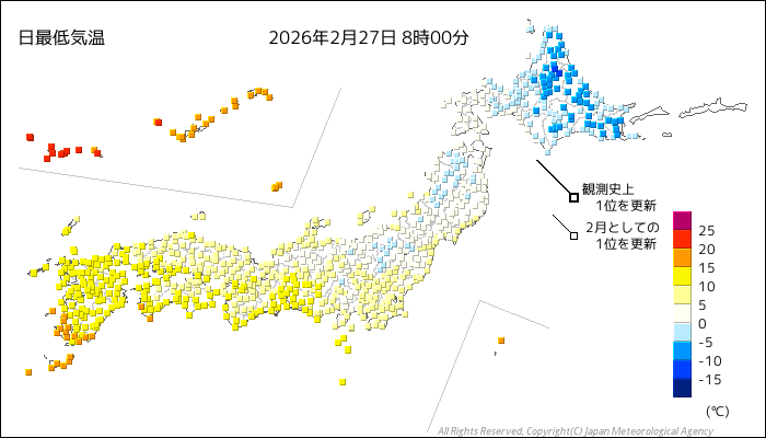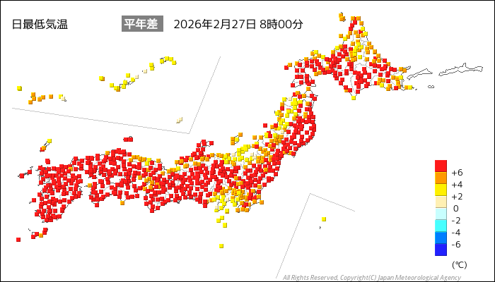 国内気温概況:2026年2月27日8時(日本時間)までの最低気温の平年差