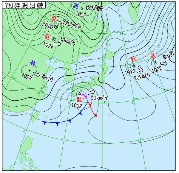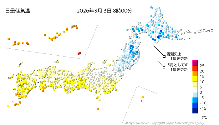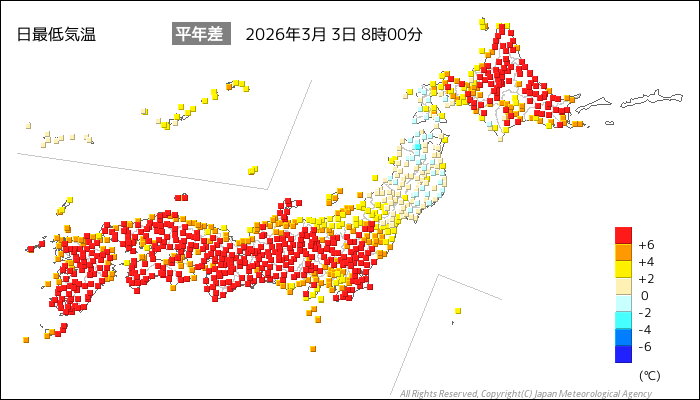 | 2026/3/3 | 8時までの最低気温平年差(小数点以下切り捨て) | |