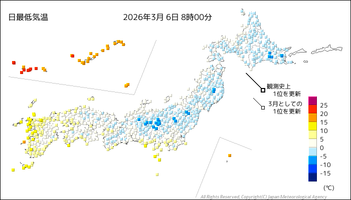 国内気温概況:2026年3月6日8時(日本時間)までの最低気温の平年差