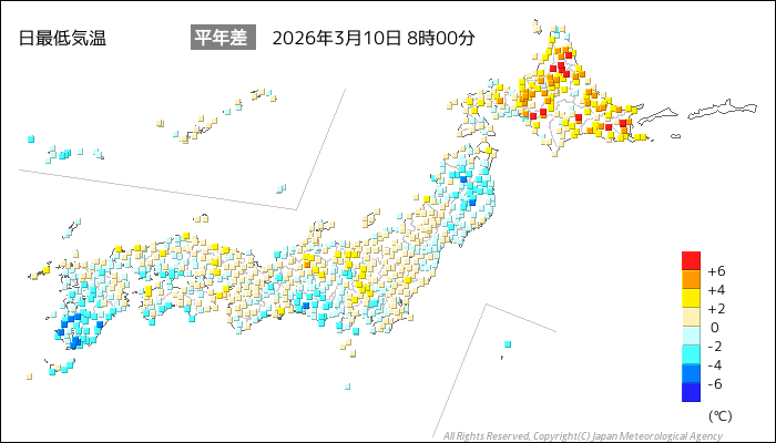 国内気温概況:2026年3月10日8時(日本時間)までの最低気温の平年差