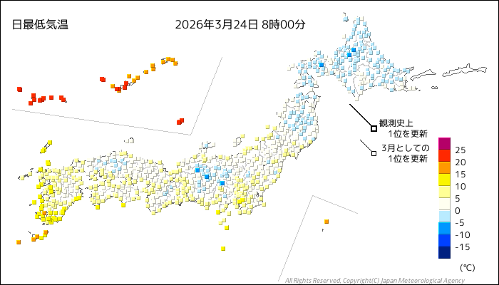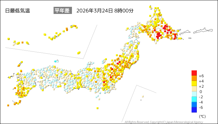 国内気温概況:2026年3月24日8時(日本時間)までの最低気温の平年差