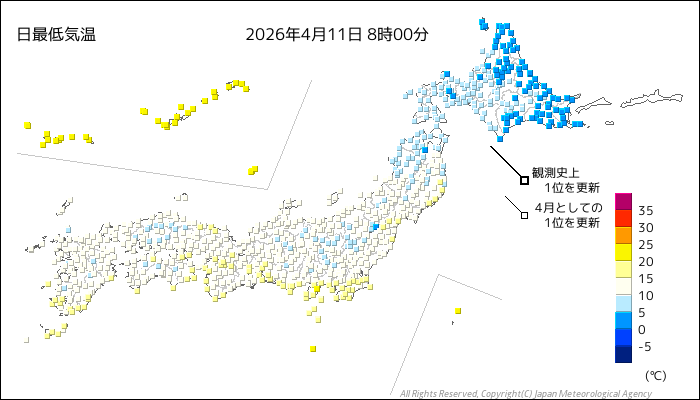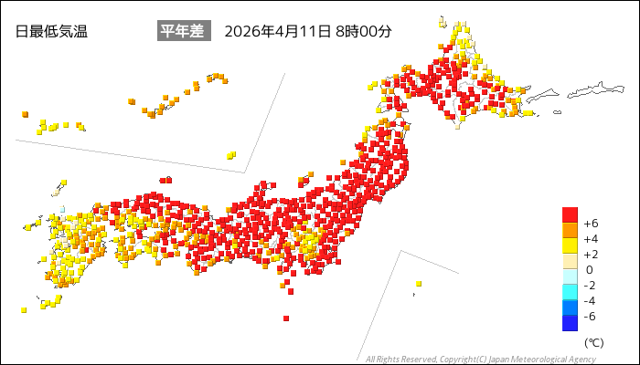 国内気温概況:2026年4月11日8時(日本時間)までの最低気温の平年差