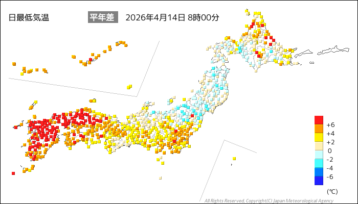 国内気温概況:2026年4月14日8時(日本時間)までの最低気温の平年差