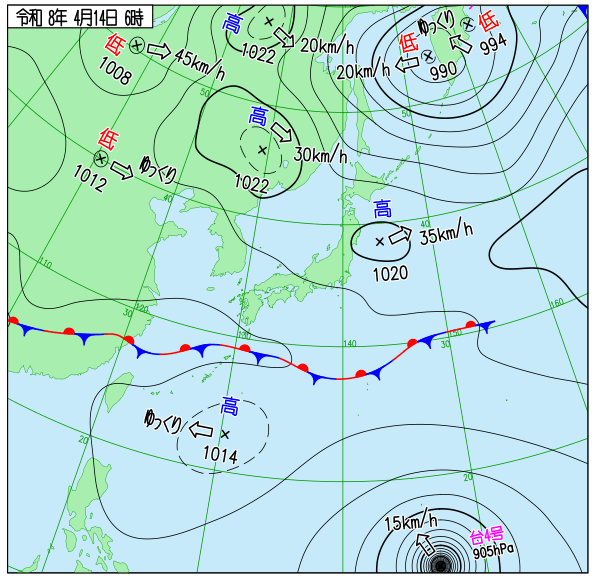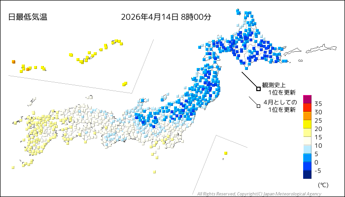 | 2026/4/14 | 8時までの最低気温平年差(小数点以下切り捨て) | |
