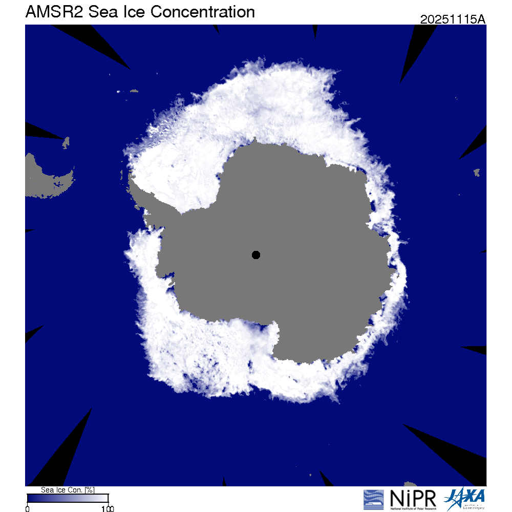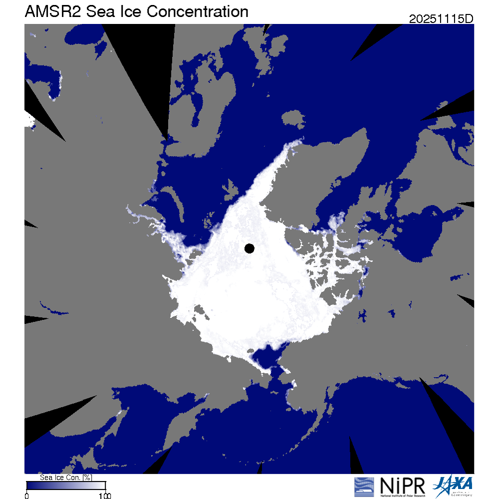 海上の氷は、海面を覆う面積により、海面から大気に供給される熱量に影響を及ぼす等の効果があり、周辺の気温への影響も大きいと考えられることから、その状況に注目しています。北極域、南極域の海氷面積の状況は地球温暖化の指標として注目されていますが、本サイトでは、風、海流、気温によって日々変化している両極域の海氷面積の動向について、概ね5日ごとにレポートします。国立極地研究所の北極域データアーカイブHP(VISHOP (nipr.ac.jp))は毎日更新されており、ここに掲載されたデータ等に基づいてレポートを作成しています。